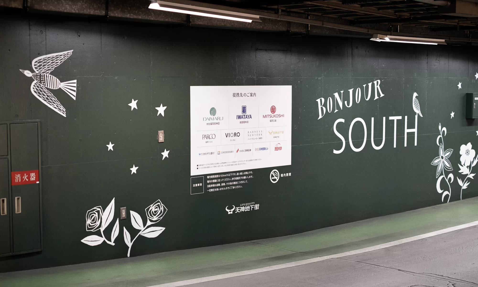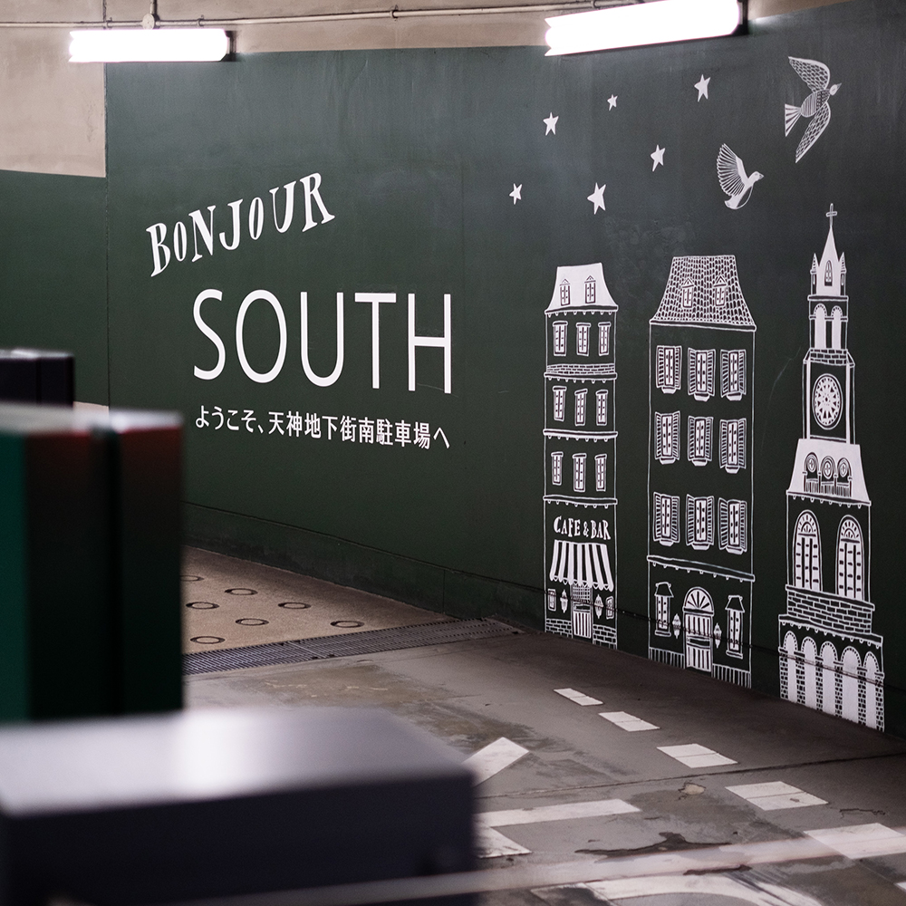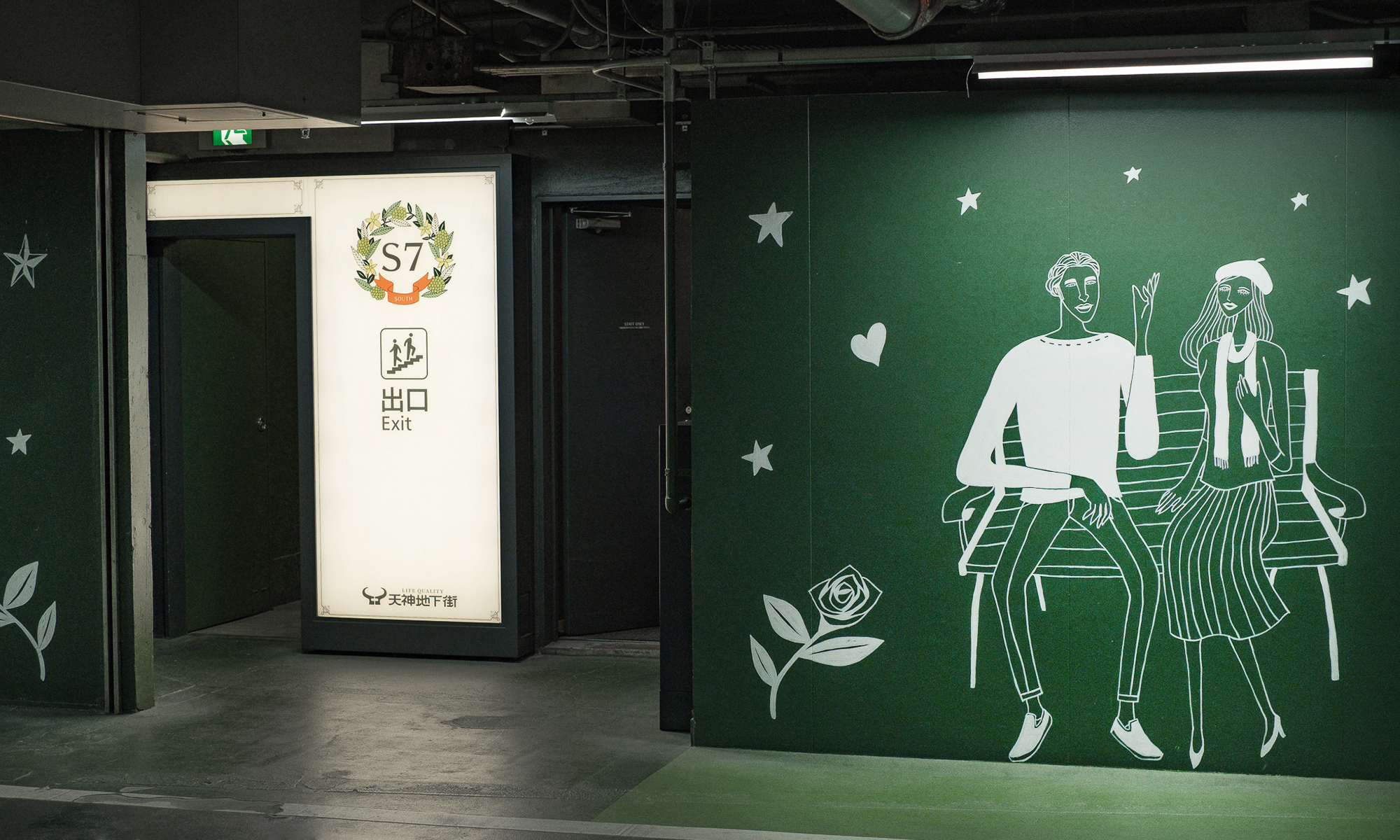 天神地下街の駐車場のサインと空間のデザイン。シャンゼリゼ通りをイメージした天神地下街の空間コンセプトを継承し、南側駐車場の南欧グリーン、北側駐車場の北欧ブルーをカラーリング。壁画イラストのコンセプトはこびとたちが潜む街をテーマに、地下街のお店へ荷物を運ぶこびとやショッピング帰りのこびとなどを作成し、地下街との連動性を計画しました。イラスト、出入口番号のマークはイフクカズヒコさんに依頼。