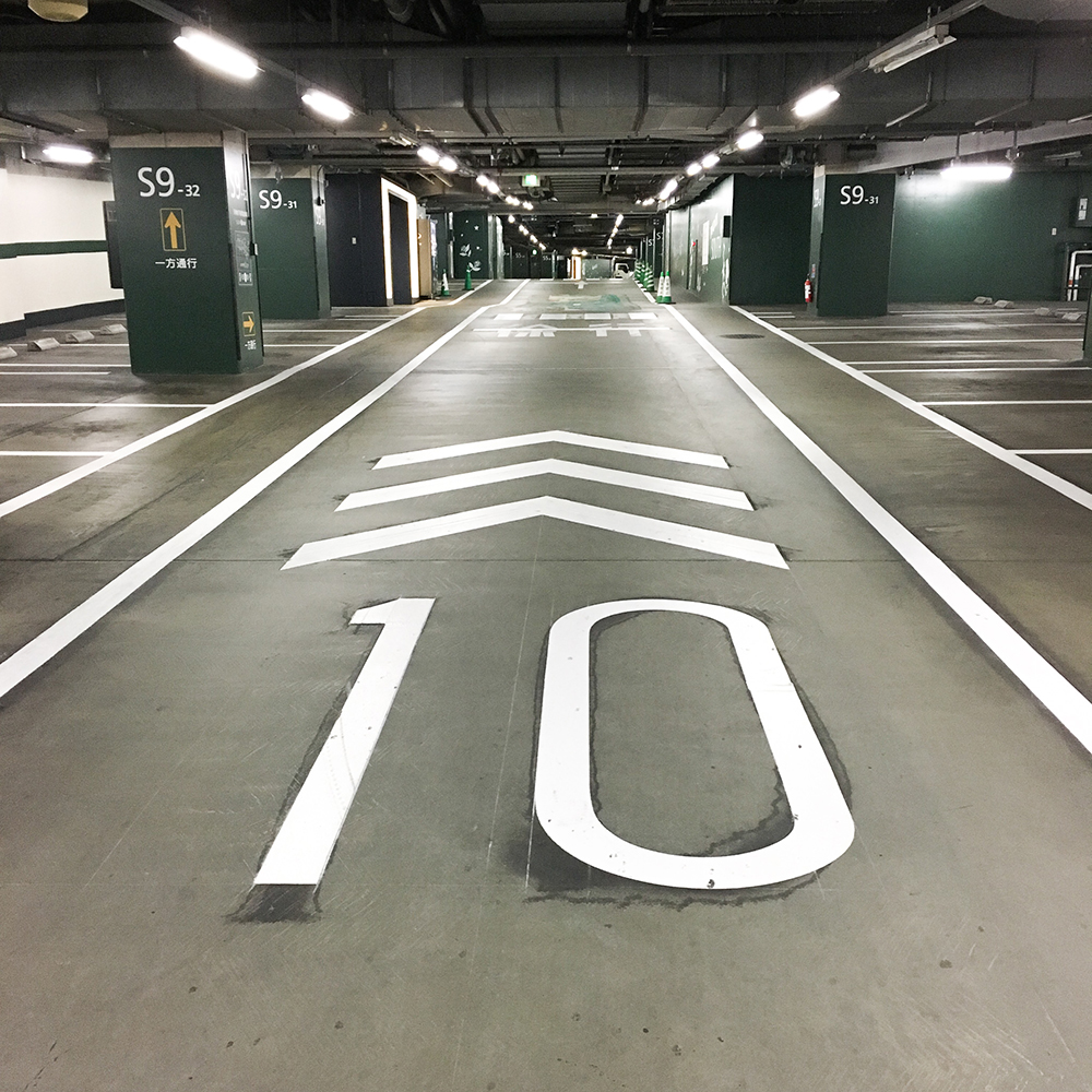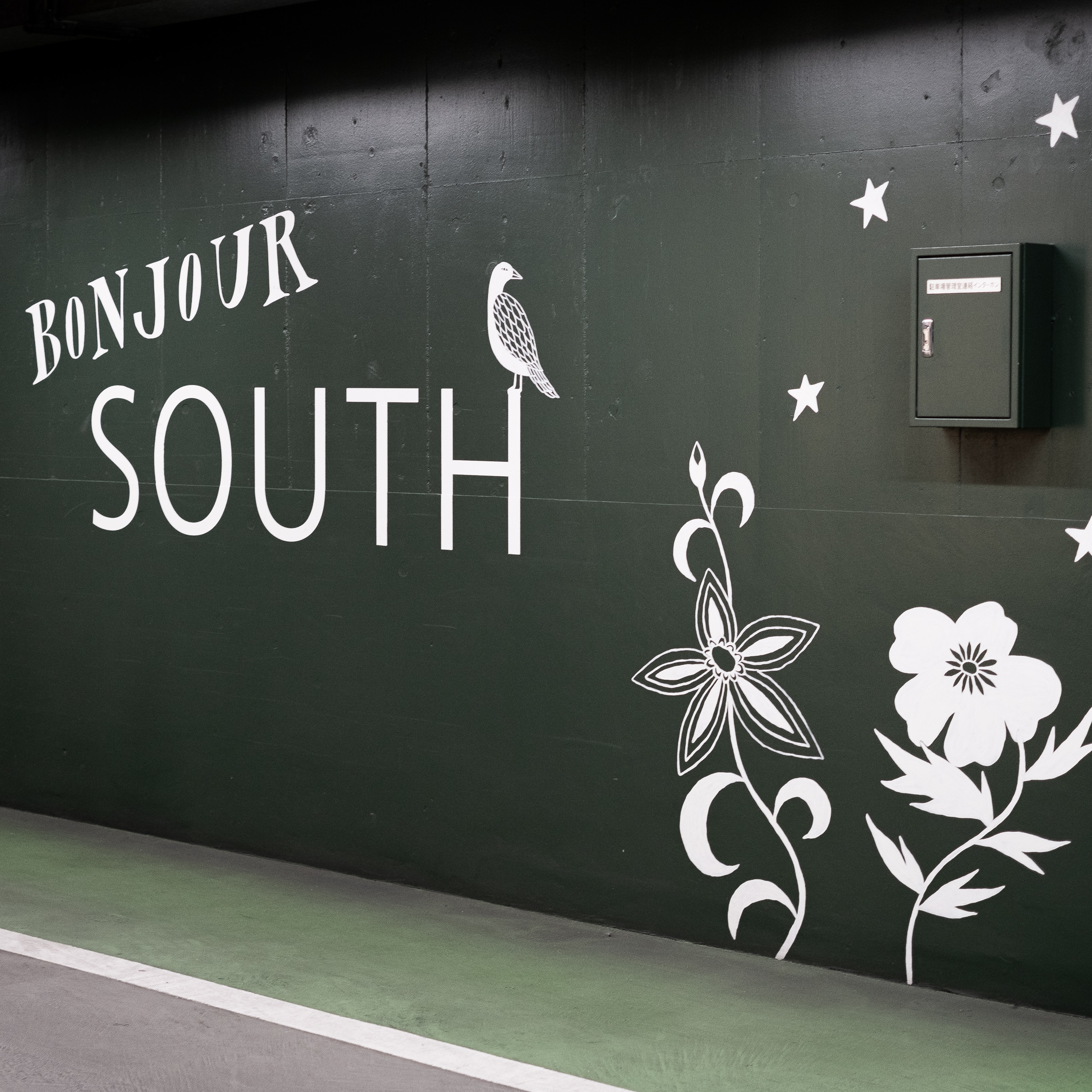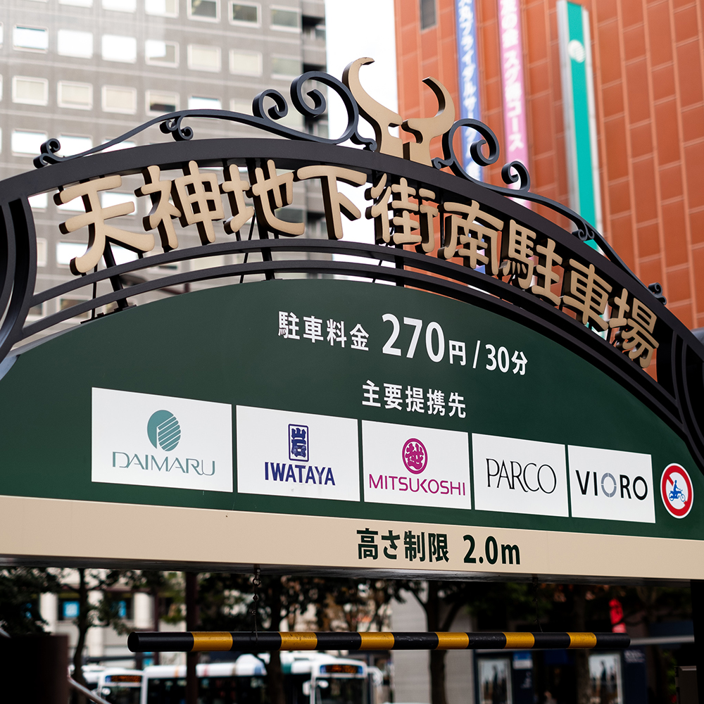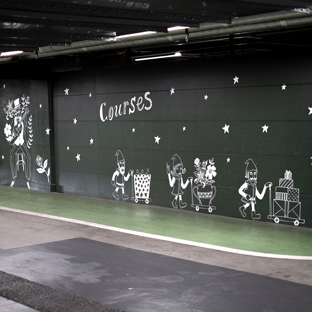 天神地下街の駐車場のサインと空間のデザイン。シャンゼリゼ通りをイメージした天神地下街の空間コンセプトを継承し、南側駐車場の南欧グリーン、北側駐車場の北欧ブルーをカラーリング。壁画イラストのコンセプトはこびとたちが潜む街をテーマに、地下街のお店へ荷物を運ぶこびとやショッピング帰りのこびとなどを作成し、地下街との連動性を計画しました。イラスト、出入口番号のマークはイフクカズヒコさんに依頼。