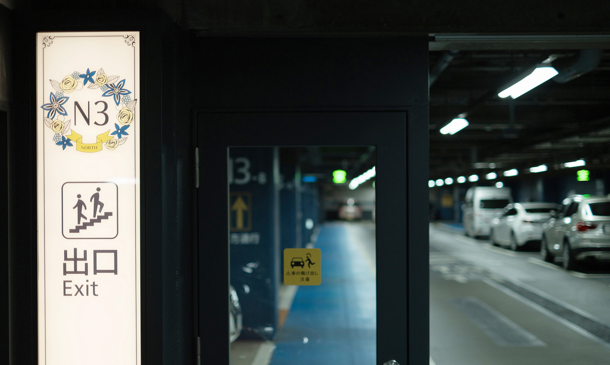 出入口の誘導サインは地下街の駐車場で自然光が届かない空間でも、可読性を考慮し光で人を導き出すことを意図。
