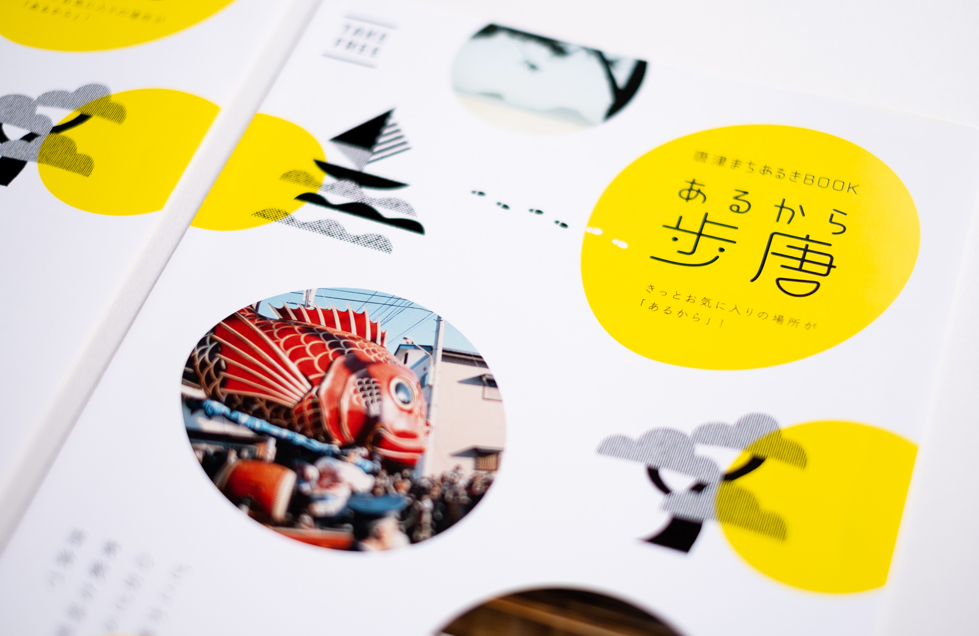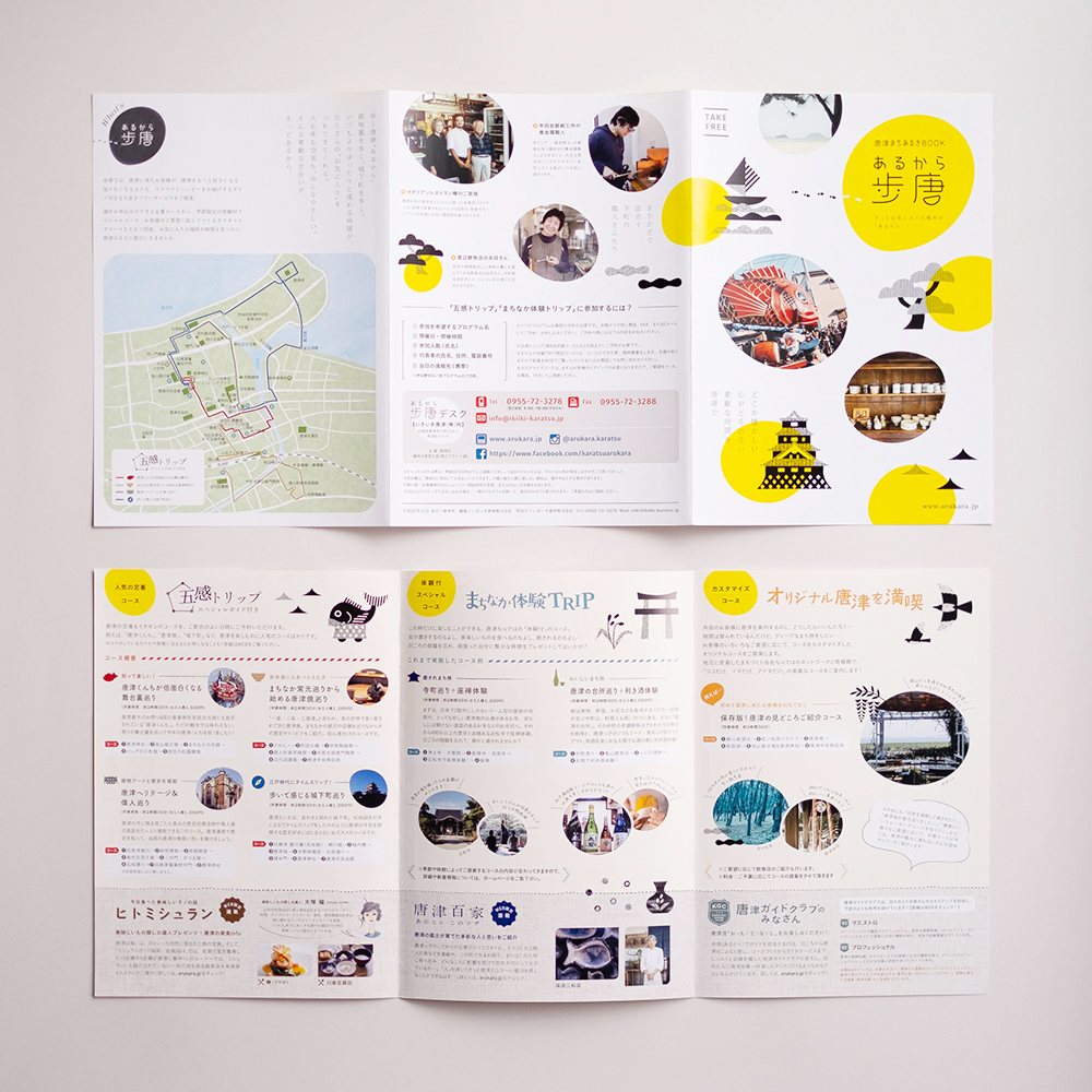 唐津の町歩きガイドブック。唐津に来たお客さんが、唐津のまちをもっと好きになる、知りたくなるようなツアーサービスを伝えることができるよう唐津に関するイラストで親しみを持ってもらえるよう構成。