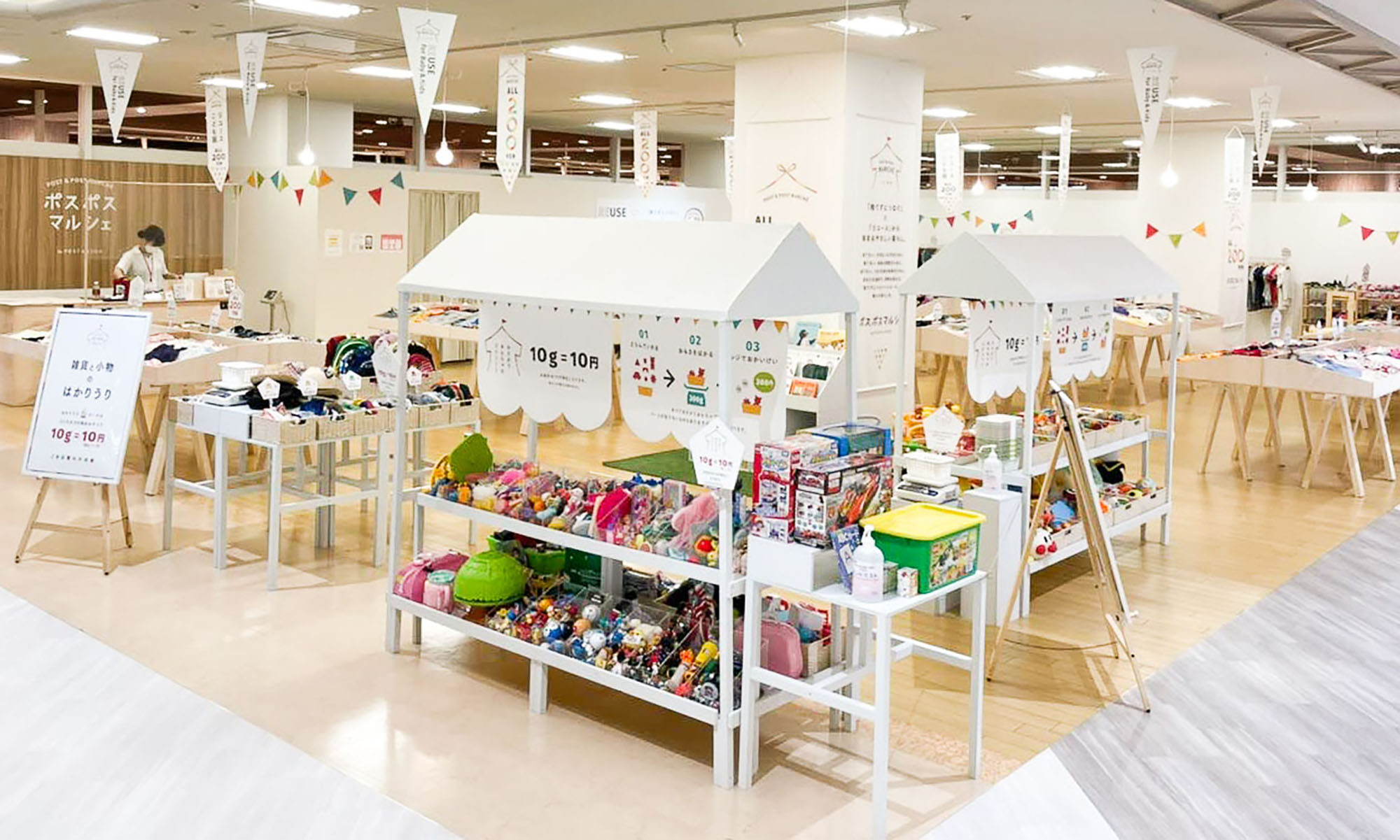 リユース子ども服がすべて200円のポスポスマルシェのブランディングデザイン。元々駅前などにテントを張りリユース子ども服を販売していたPOST&POSTのコンセプトを継承し、服とマルシェテントを組み合わせたシンボルマークを作成。ALL200円と楽しく訴求できるよう200をアイコン化することで印象に残るビジュアルを計画し、家族で入店しやすいようやわらかい空間のデザインを心掛けました。