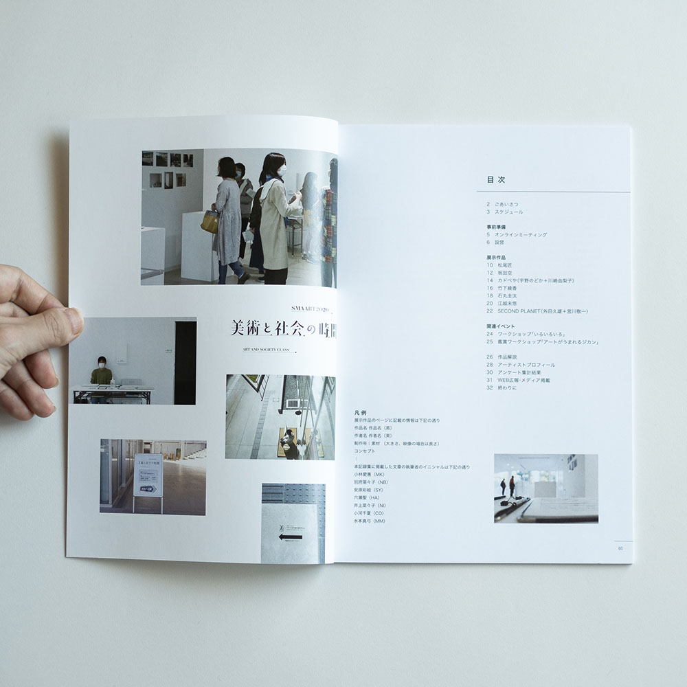 学生が主体となったプロジェクトのロゴデザイン。学生と社会、美術と社会を結ぶ過程を表現するために、時間(タイムライン)をイメージした文字でプロジェクトの概要を表現。記録集は江副の指導のもと佐賀大学芸術地域デザイン学部の学生が編集とデザインを自ら進行。
