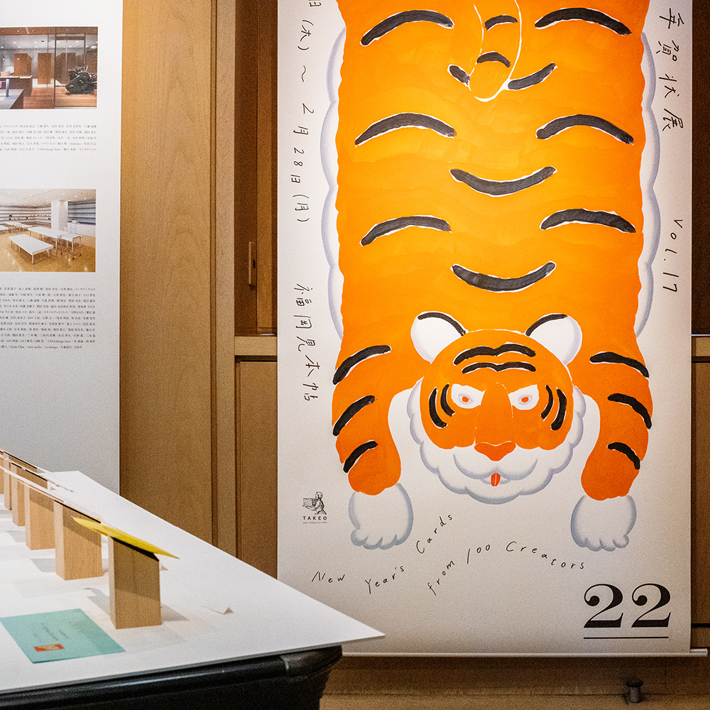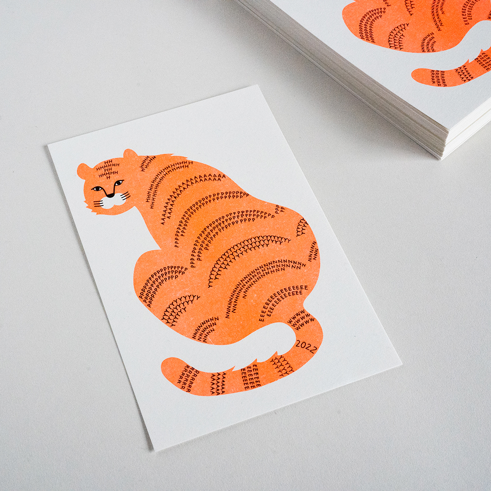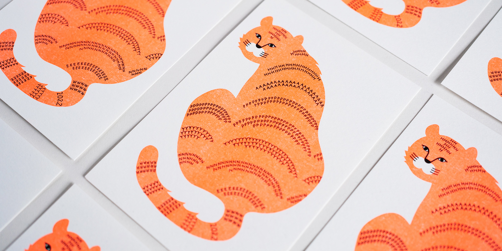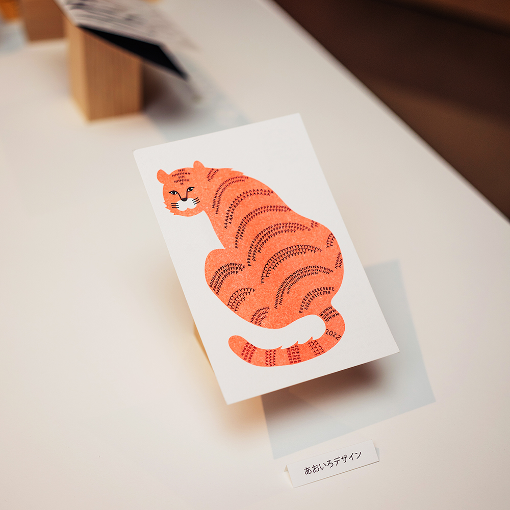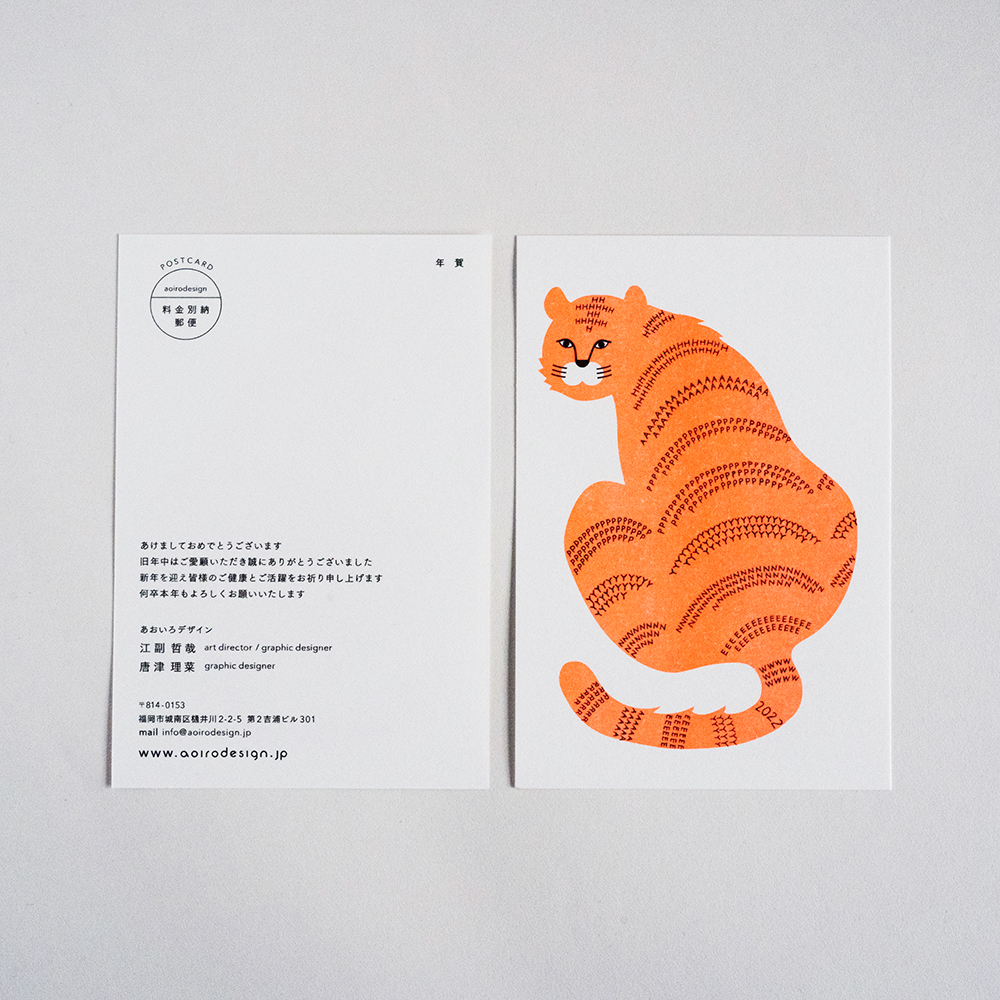 一見トラの年賀状だが、トラ柄模様には「HAPPY NEW YEAR 2022」の文字列になっている。