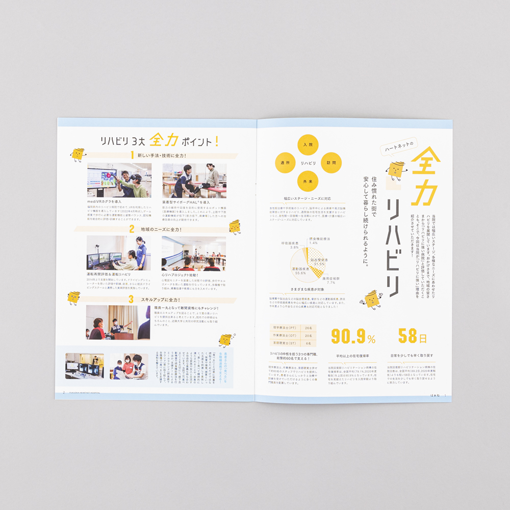 病院案内や入院案内と同様にさまざまな年代の方への見やすさを心がけた文字の大きさや色使いを意識した編集を心がけた。