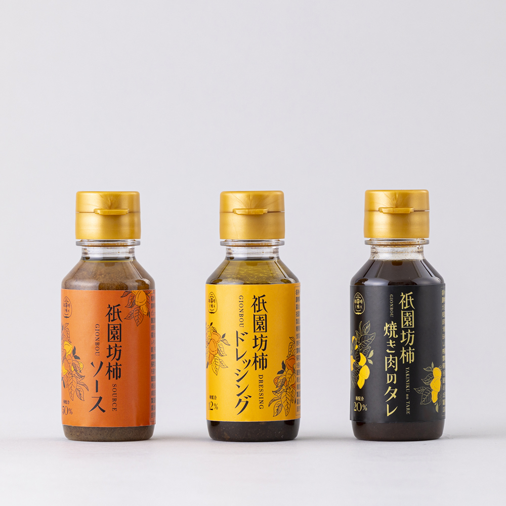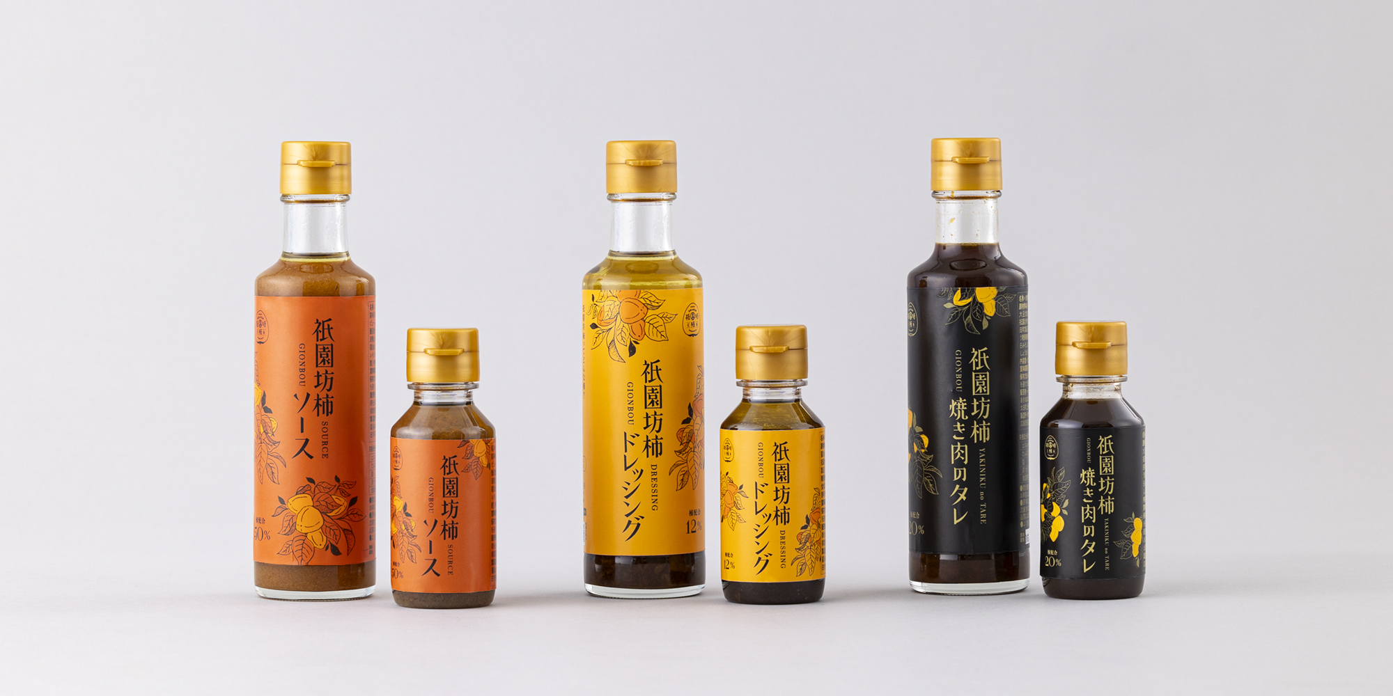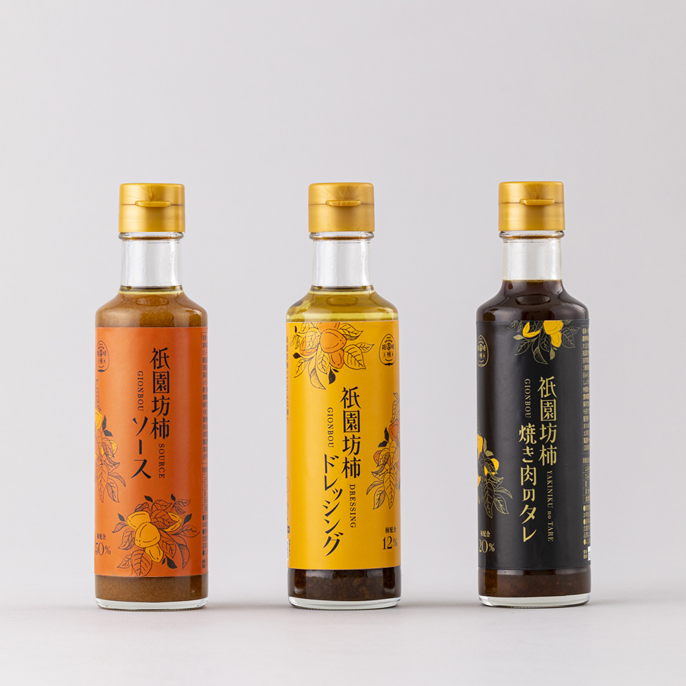 安芸太田町特産の祇園坊柿を使ったソース・ドレッシング・焼肉のタレのパッケージデザイン。
