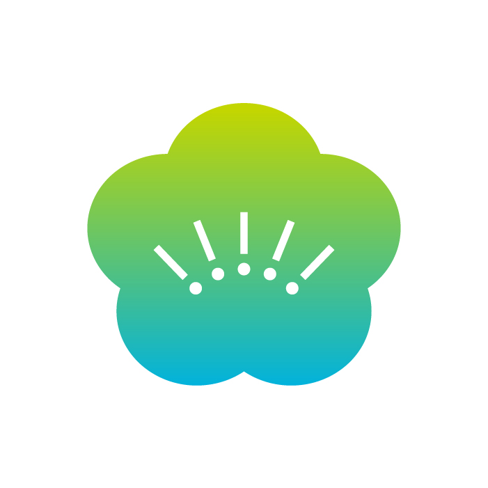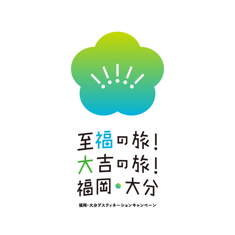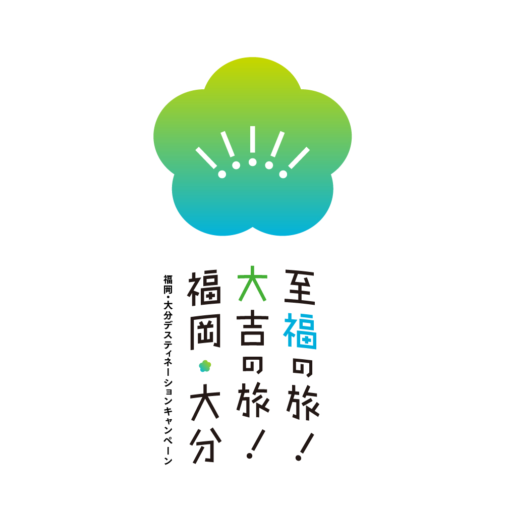 福岡の県花である「梅」と、大分の県花である「豊後梅」をかたどったロゴマーク。両県の「県境のない旅」を、旅の心おどる楽しさ・爽快さを感じさせるブルー×グリーンの2色のグラデーションで表現。キャッチコピーである「至福の旅!大吉の旅!」の「!」を、旅を通して出会う両県での発見と捉え、梅の花のおしべになぞらえてロゴの中央に入れています。