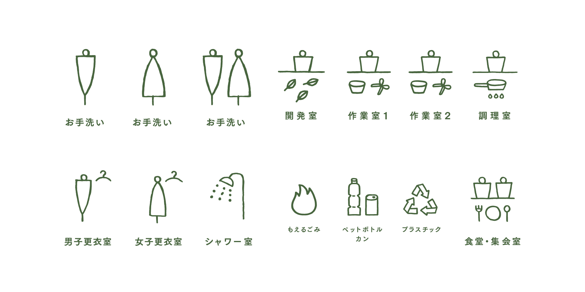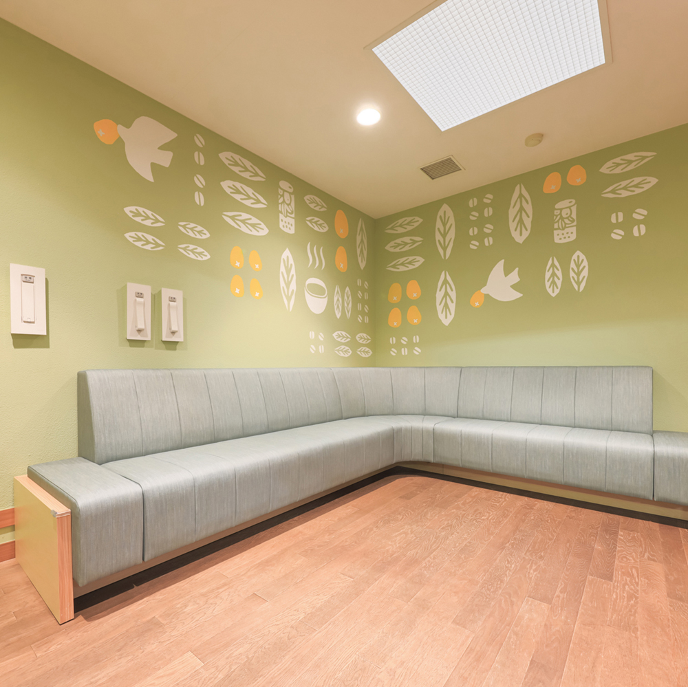 利用者の皆さんが笑顔で過ごせるよう、明るく温かみのある壁面グラフィックを制作しました。デザインには、枇杷の成長を利用者さんの成長に、枇杷の加工を利用者さんと職員さんの誇りに重ねる想いを込めています。