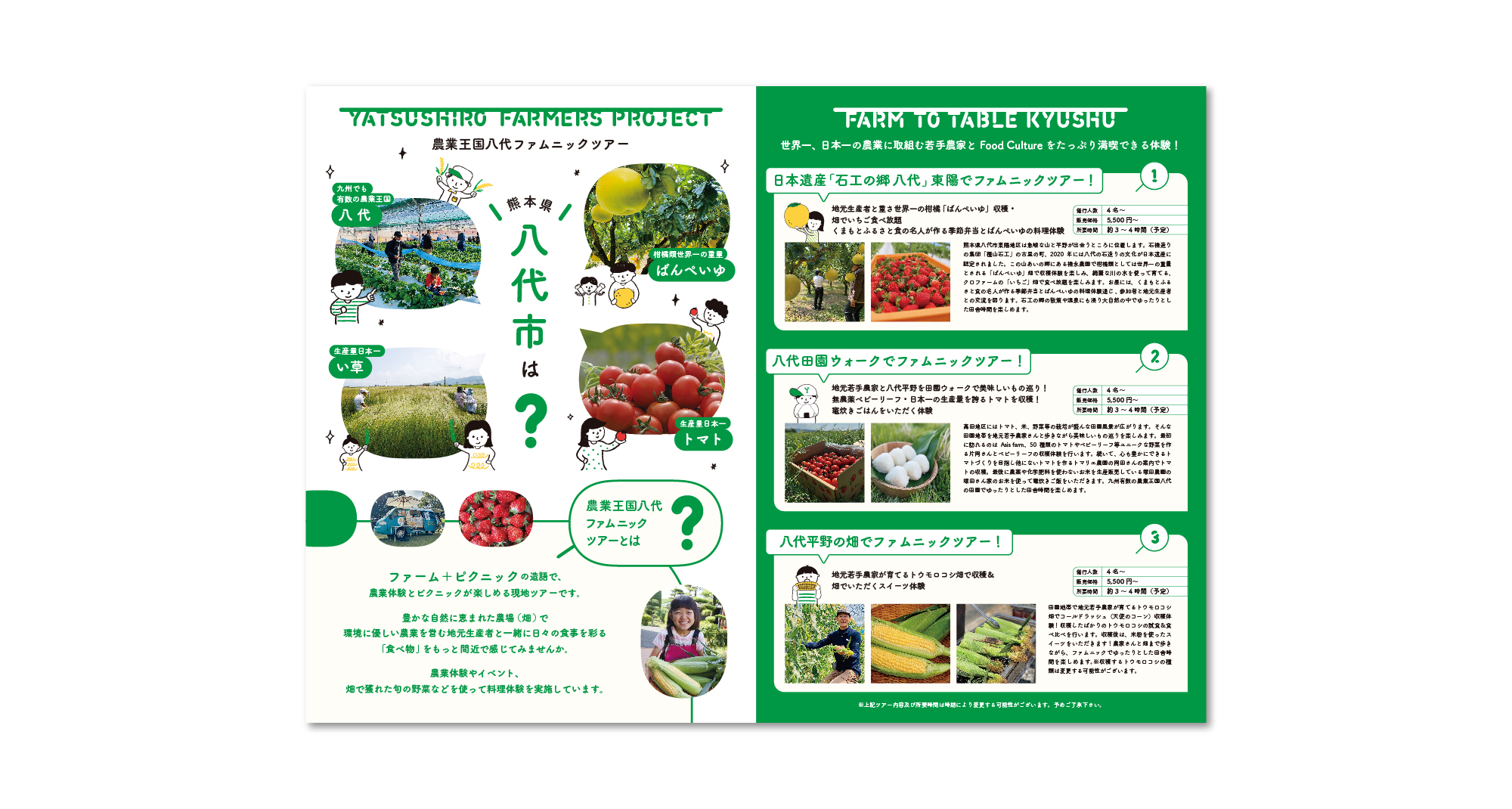 「ファムニックツアー」は、ファーム(農場)とピクニック(屋外での食事)を融合させた新しい体験型ツアーです。八代のファームプロジェクトの一環として、このツアーの魅力をより伝わりやすくするため、イラストとロゴタイプを活用したビジュアルで表現しています。