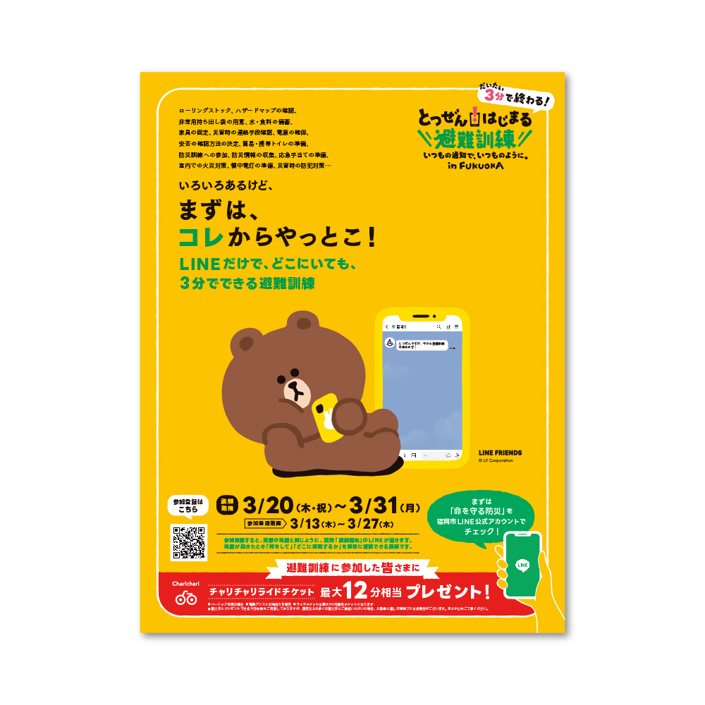 「とつぜん!はじまる避難訓練」は、LINEを通じて突然通知が届き、日常の延長で自然と防災を体験できるサービスです。