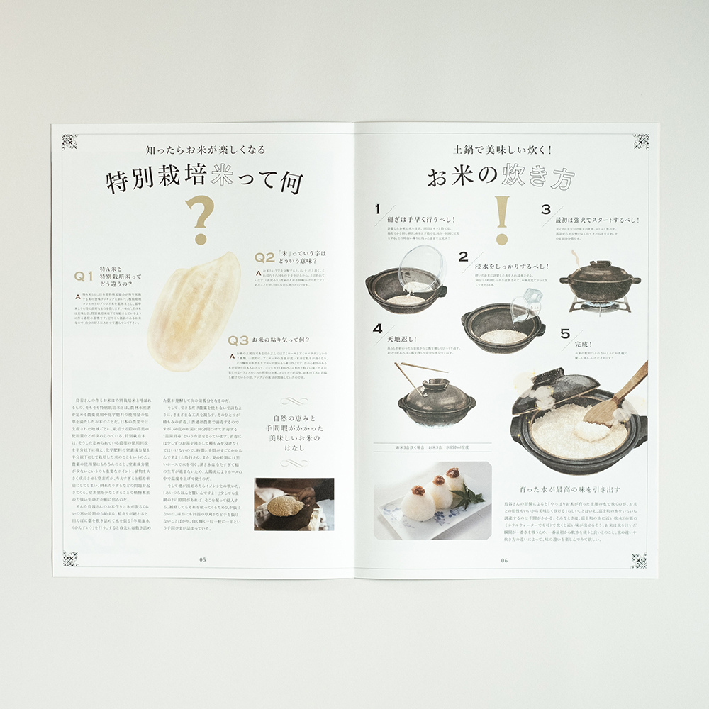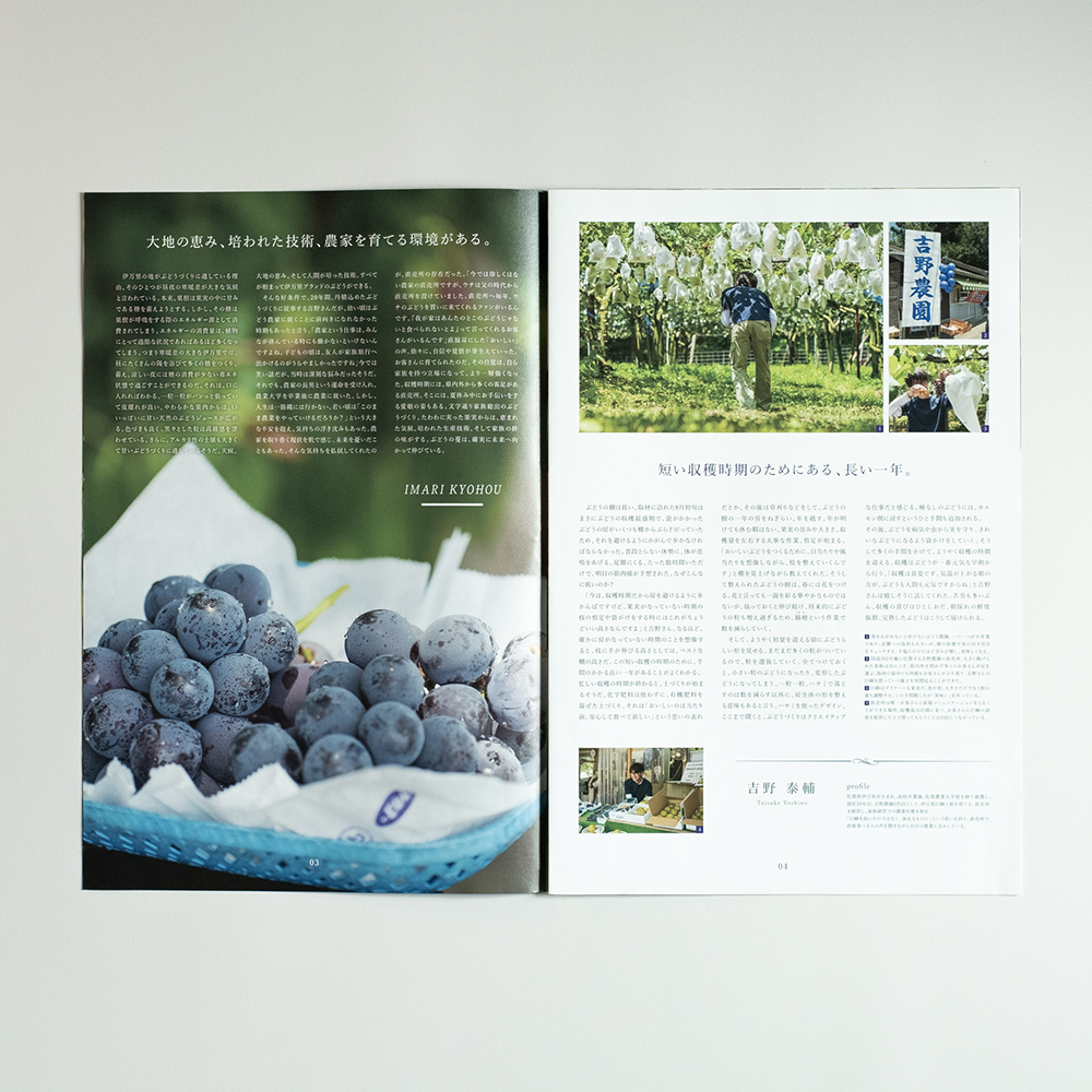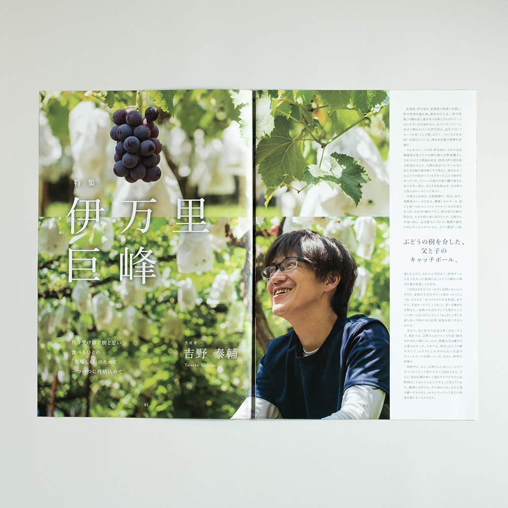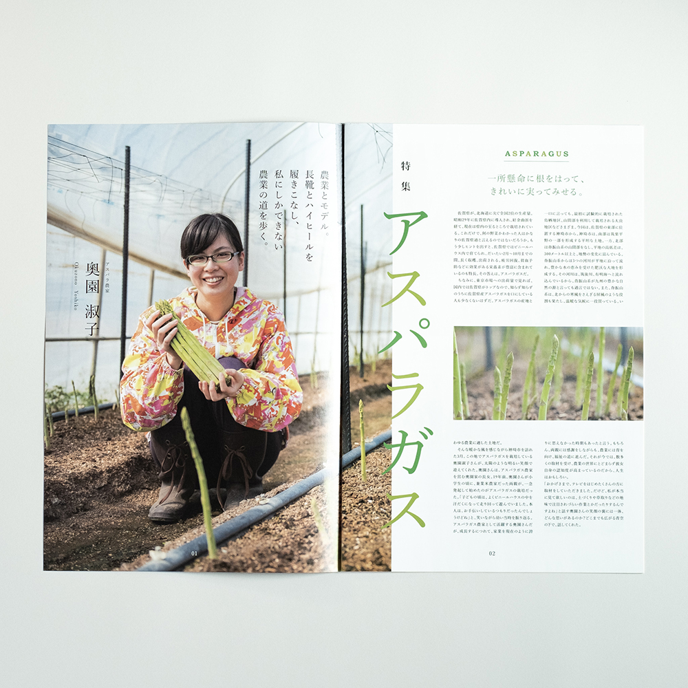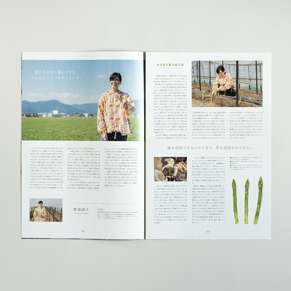 食を題材にした編集物の表紙は、食べ物メインのビジュアルが多い中、他の編集物と差別化をはかるため、生産者の表情に焦点をあて、モデル雑誌風に表紙を作成しました。中面のデザインは生産者のリアルな現場を伝えたく、人情と情景にフォーカスし写真を大きめにレイアウトすることで現場の空気感を表現しました。